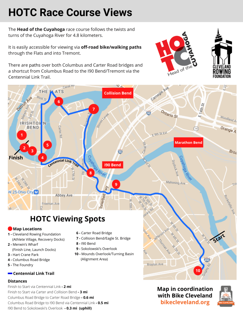 There are paths over both Columbus and Carter Road bridges and a shortcut from Columbus Road to the I-90 Bend/Tremont via the Centennial Link Trail.